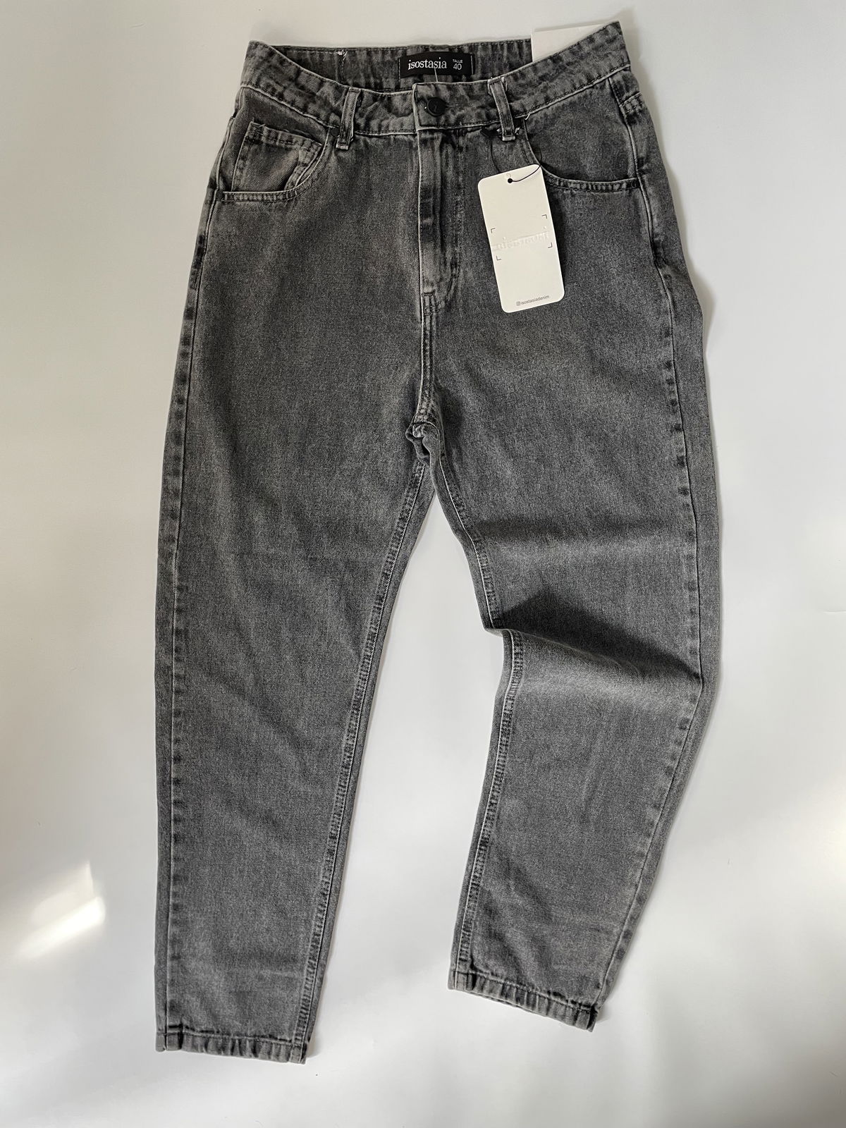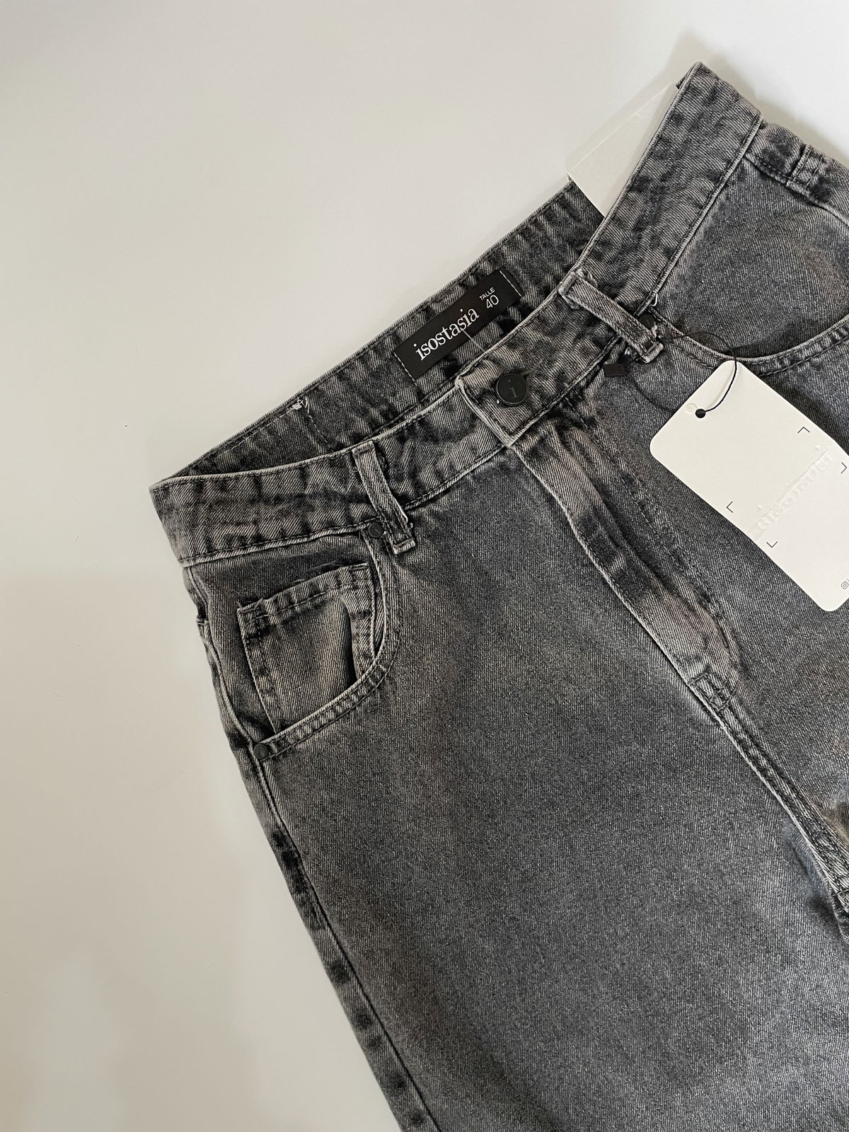 Mom fit rígido 100% algodón. Tiro alto. Botón y tachas zamak. Cierre YKK.