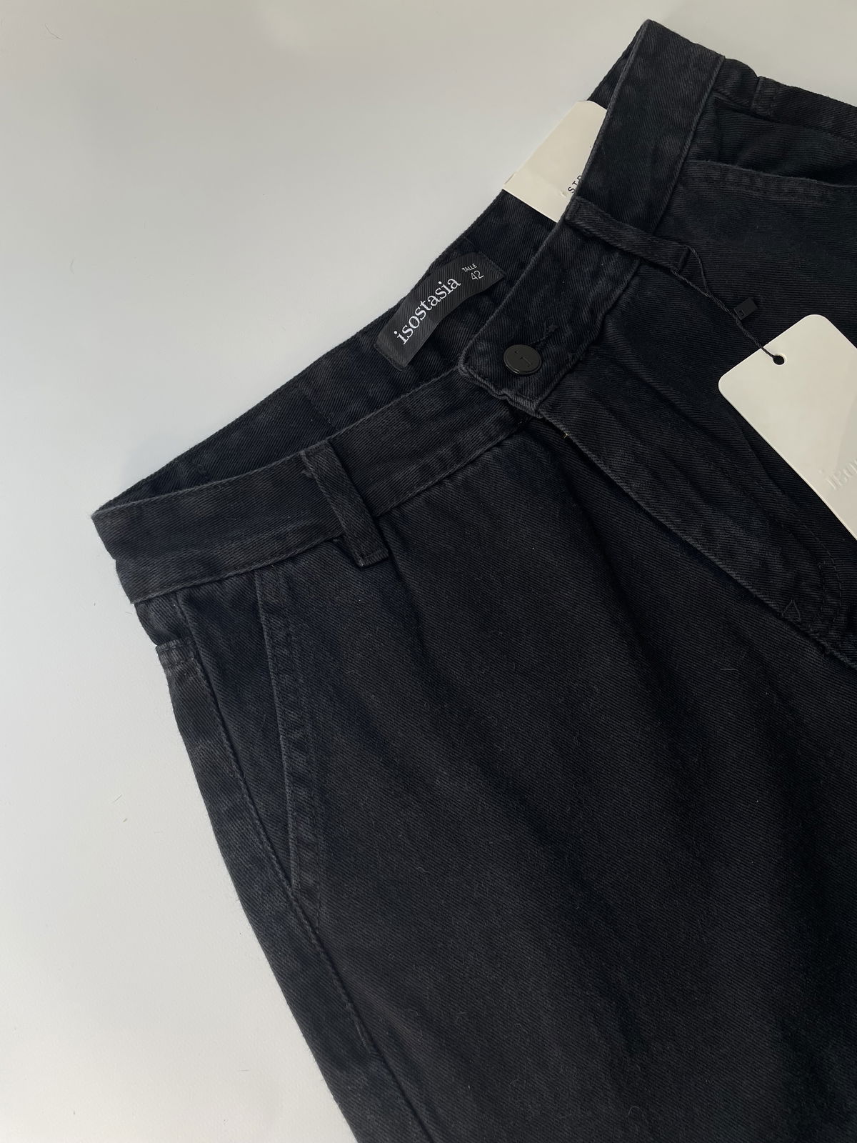 100% algodón. Tiro alto. Bolsillos chinos. Botón y tachas zamak. Cierre YKK.