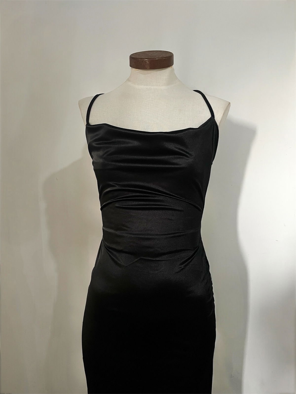 Vestido largo con tajo, espalda descubierta y elástico en la cintura.